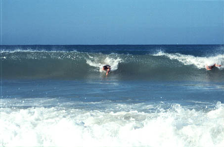2. trin i BodySurf....svøm indtil bølgen skubber der frem....Gutten ved siden af mig rammer bølgen perfekt !!
